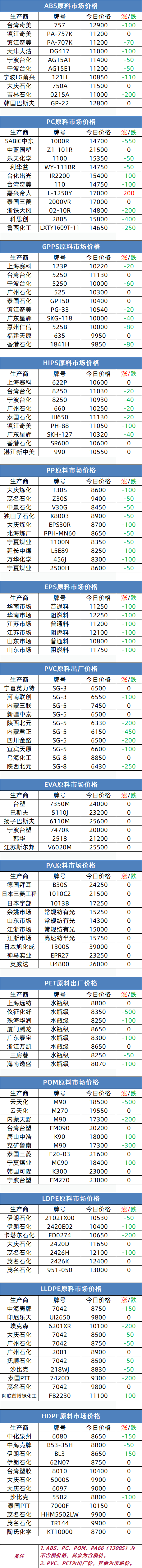 ABS:国内市场价格继续下跌,宏观环境利空充斥,终端需求乏力,价格整体走低。行内暂无利好消息提振,预计国内ABS市场价格继续维持下跌态势,今日华南地区0215A市场价格参考在11000元/吨(未含税)左右。